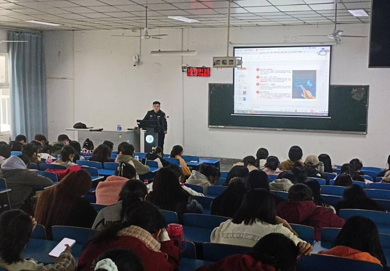 随后,张警官娓娓道来,以通俗易懂的语言向同学们详细讲述了什么是电信网络诈骗,他围绕“电信网络诈骗的危害、为何屡屡有人中招、常见的电信网络诈骗手段、如何预防电信网络诈骗、预警劝阻”等五个方面展开精彩深入的讲解。其中,张警官关于电信网络诈骗手段的生动讲授令人印象深刻,典型案例有刷单诈骗、办理银行卡与贷款诈骗、网络交友诱导赌博、冒充公检法诈骗、冒充领导熟人诈骗、冒充购物客服退款诈骗等等。他衷心希望同学们在了解了常见的诈骗手段后,遇到相关情况能提高警惕。与此同时,他还细心讲述了如何辨别冒充公检法诈骗手段,明确表示公安机关内部不会透露相关法律文书,如遇不确定情况可以去公安机构咨询。
