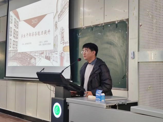 第一讲由新生辅导员余昕阳老师为全体学生干部作《学生干部实务能力提升》专题授课。他从“为什么要在这里、你的三种身份、应该具备的精神、要把握的关键、该承担的责任、必备公务技能”等六个方面展开讲解。在讲解过程中他采用理论与实操、言传与典例相结合的方式,向学生干部进行了办公技能操作培训演示,分享了他的工作经验与技巧,以及一些实用的办公资源网站。最后,余老师寄语全体学生干部,希望学生干部们能牢固树立规矩意识,找准自身定位,勇于担当责任,发挥好自身在老师与学生之间的沟通桥梁作用,敢于通过努力成为模范标杆,示范引领、带动学生。